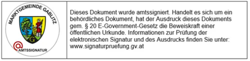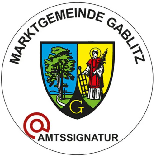 Die grafische Gestaltung der Bildmarke obliegt der jeweiligen Behörde. Aus Bürgersicht ist es aber empfehlenswert, dass sich Behörden beim Erstellen der Bildmarke an einem einheitlichen Design orientieren. Die Marktgemeinde Gablitz verwendet deshalb folgende Darstellung als Bildmarke für die Amtssignatur.